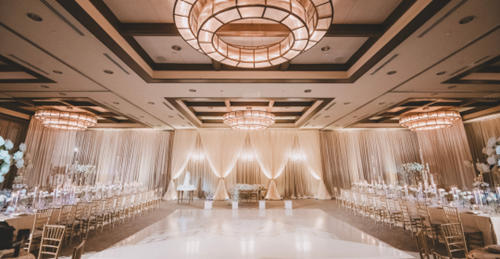 Ally has seen the room transform under various themes, from the sharp, timeless elegance of a black-and-white wedding to the soft, organic feel of sage green decor. Cathi points to the "Hollywood Regency" feel of the space when rich drapes are hung as a layer of texture and warmth to the room.