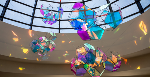 This space is centered around a massive glass dome that invites the outside in. During the day—especially when the sun is directly overhead—the dome’s signature art piece creates a geometric light show, scattering rainbow reflections in shades of pink, green, blue, and yellow across the floor.